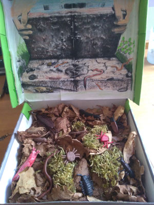 Fragt eure Eltern ob sie noch Fimo-Knete zu Hause haben (ist ähnlich wie Plastilin, man kann es aber im Ofen brennen). Daraus könnt ihr dann die verschiedensten Bodentiere basteln. Nehmt hierzu ein Bestimmungsbuch oder sucht im Internet nach Bodentieren. Dann füllt ihr eine Schachtel mit Laub, Moos, etwas trockener Erde und Steine. Darin versteckt ihr dann eure Bodentiere. Wenn ihr Besuch bekommt, dann zeigt eure Bodenschachtel her und lasst euren Besuch nach den Bodentieren suchen. Ihr könnt dann super erklären, was alles im Boden lebt und warum diese Tiere so wichtig sind.