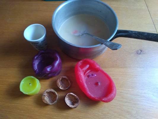 Doch Vorsicht, das Wachs muss geschmolzen und in die Walnuss- und Eierhälften eingefüllt werden. Dies macht ihr am besten mit euren Eltern!